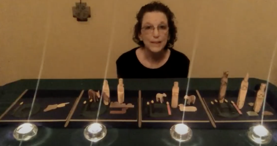 Godly Play Trainer, Arlene Decina, from Christmas Eve service (Advent lesson interspersed with Lesson in Carols), via Zoom, in December 2020.